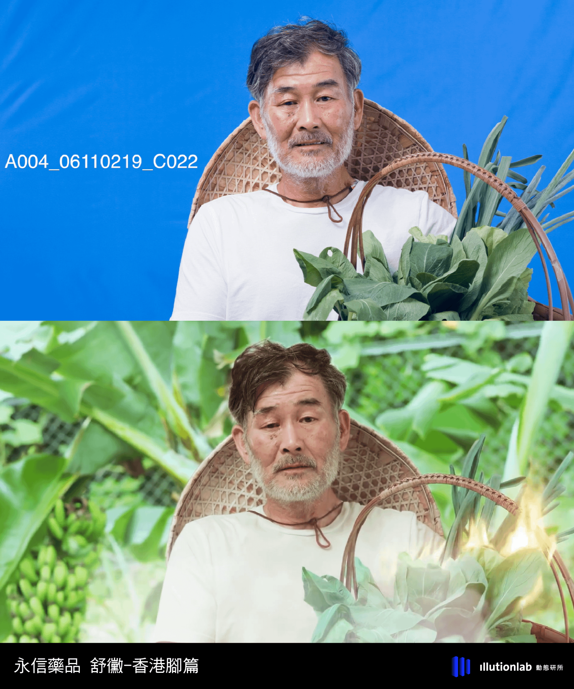 像下面這個案例也是一樣,因為前景阿伯抱著綠色蔬菜,所以選擇藍幕。