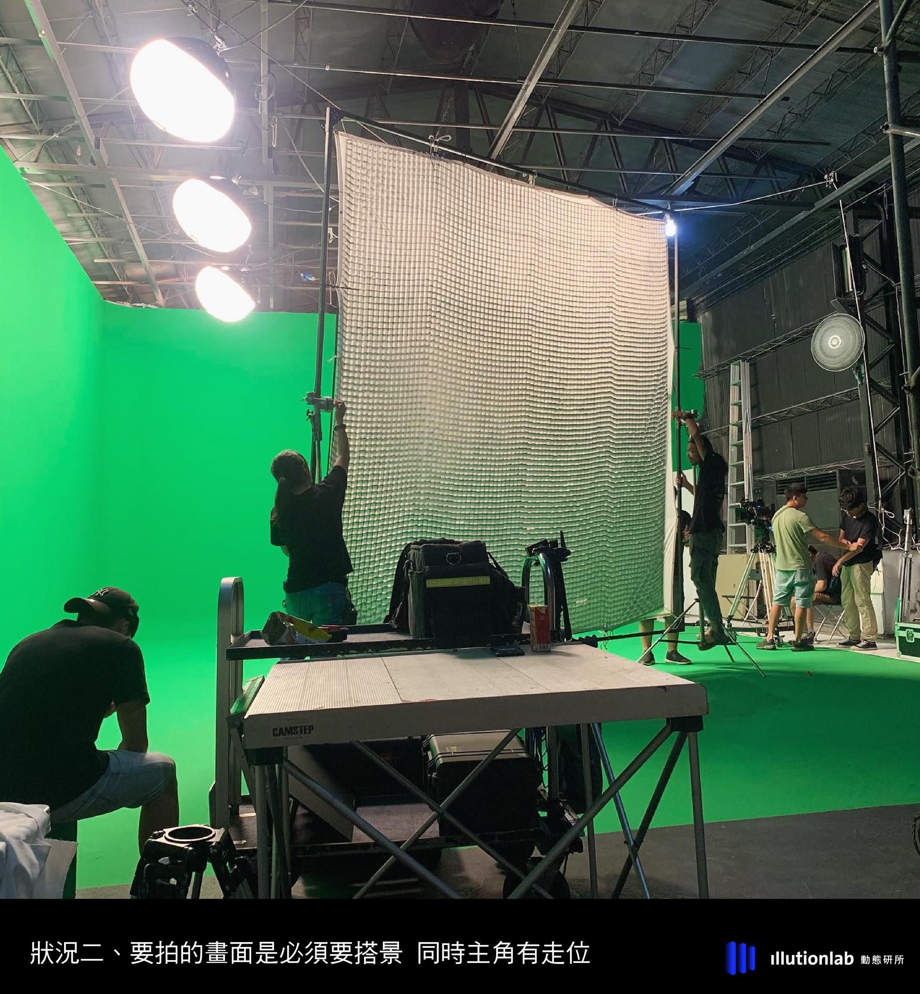 攝影機運動:跟拍、或是推軌(場景上有透視改變的畫面)那麼除了場地上我們會需要一個大綠幕攝影棚,讓背景夠涵蓋整個角色的活動範圍之外,在現場可能也需要搭配一些追蹤點(Marker),讓後期人員可以後製還原現場的透視。